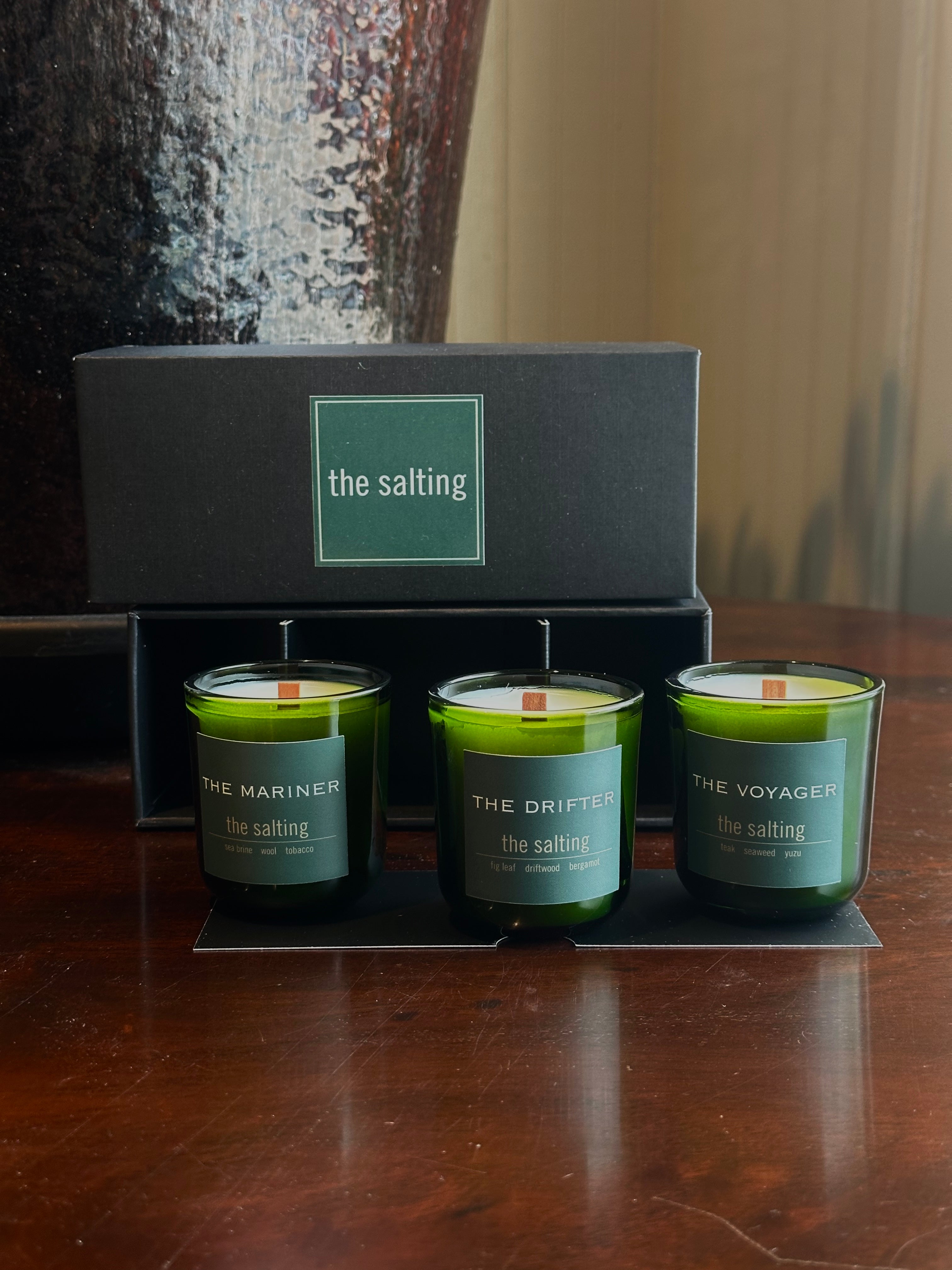 the salting candle collection is hand poured on long island. using a wood wick, heavy green glass container and wooden top.