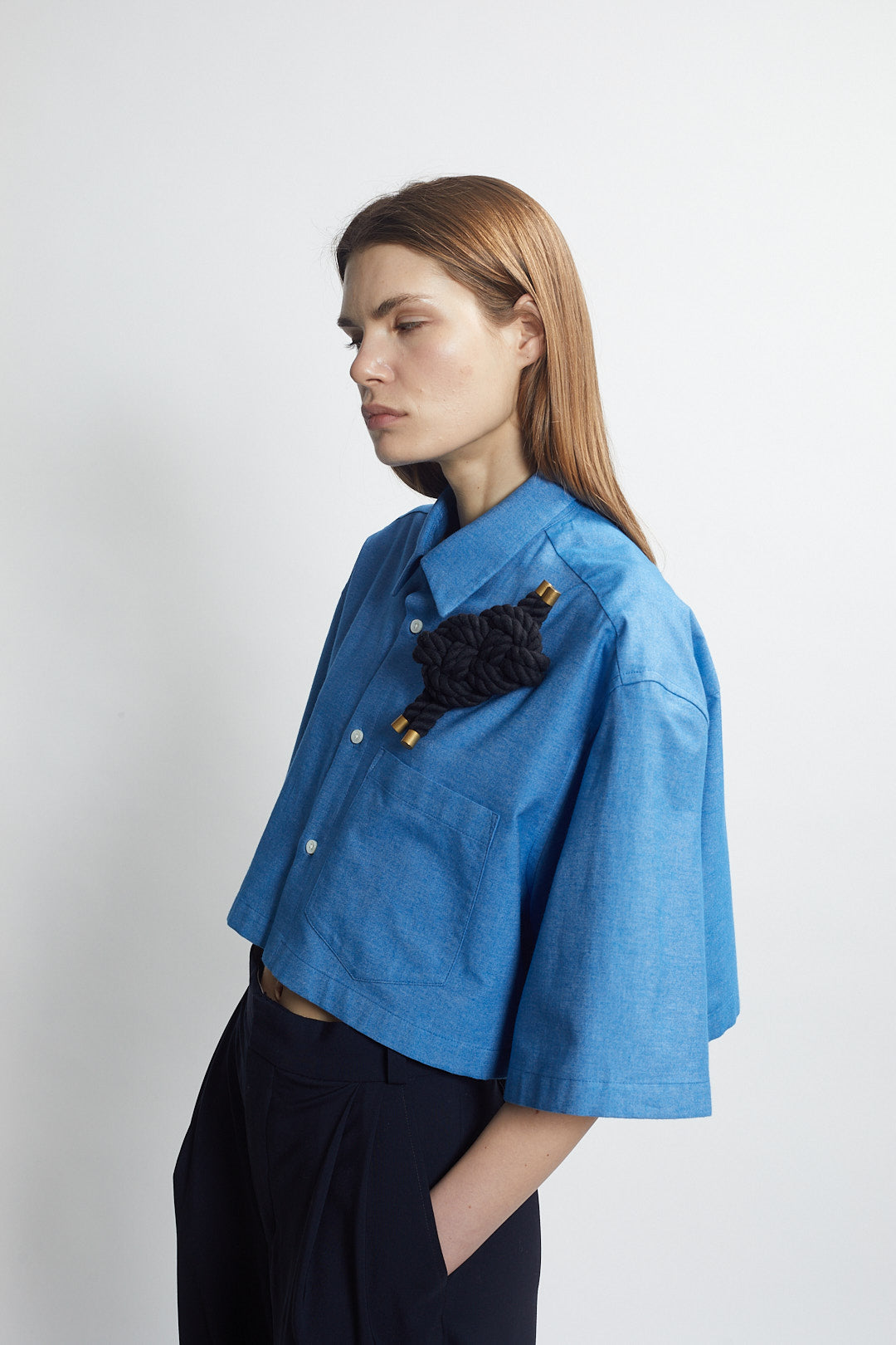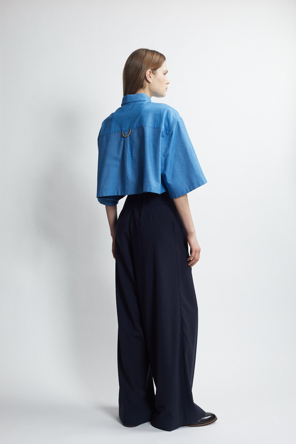 an updated take on the cropped box shirt in italian brushed cotton. yarn dyed, sueded texture in a vibrant ocean blue.